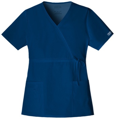 A mock wrap top features an adjustable drawstring waist and patch pockets. The right side pocket has a sectional pocket and I.D. loop, the left side sectional pocket has double instrument loop holder. Back elastic and side vents complete the picture. Center back length: 26"